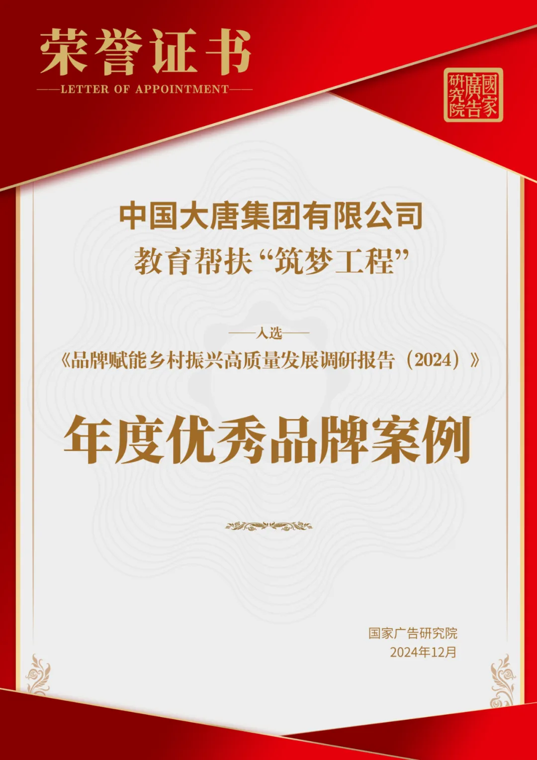 近日,在《品牌賦能鄉村振興高質量發展調研報告(2024)》發布暨鄉村振興品牌發展評價指標體系論證會上,《中國大唐集團有限公司教育幫扶“筑夢工程”》入選年度優秀品牌案例。