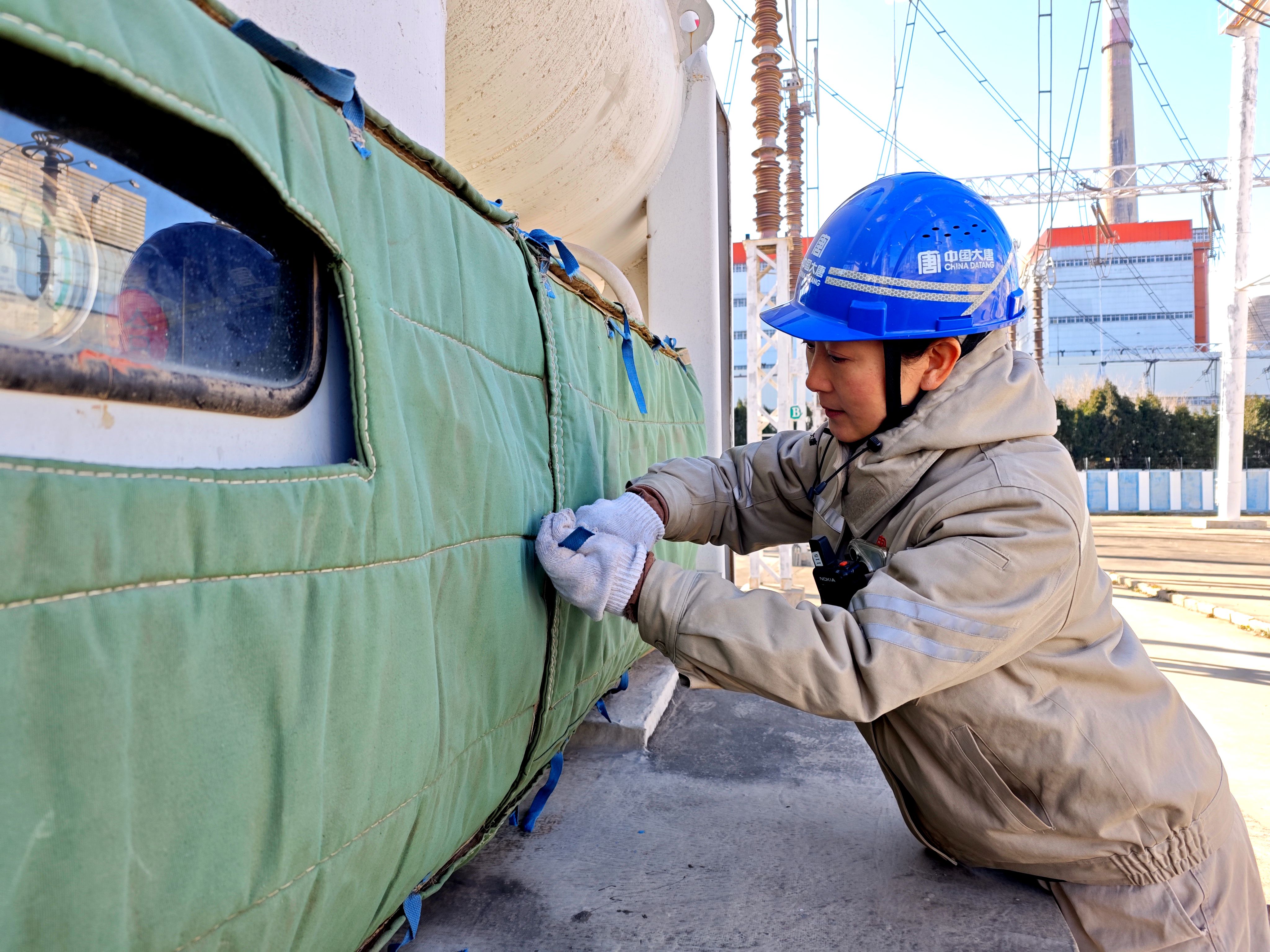 “這個接口處要包嚴實,不能留一點縫隙,不然熱氣都跑了。”班長趙詩宇一邊指導年輕員工郝巖包裹開關接線口,一邊提醒道。郝巖認真點頭,手上動作更加細致:“明白,班長。這保溫棉貼合度真不錯,裁剪得也正合適?!?/p>