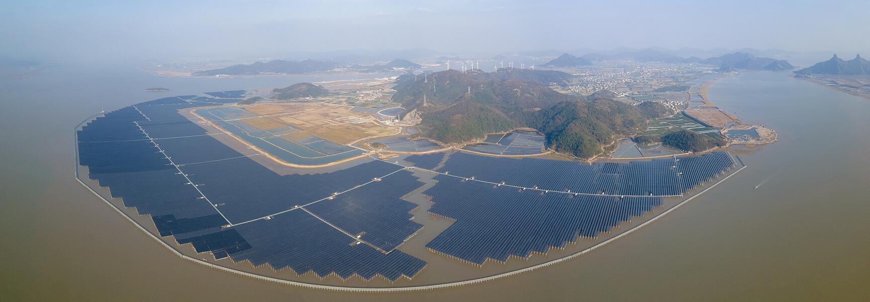東海之濱象山縣高塘島鄉(xiāng),國內(nèi)首個大型海岸外灘涂光伏電站--長大涂光伏電站--;60多萬塊光伏組件在陽光下熠熠生輝。該電站每年可生產(chǎn)清潔能源2.9億千瓦時,減排二氧化碳24萬噸,相當(dāng)于種植13萬顆樹。
