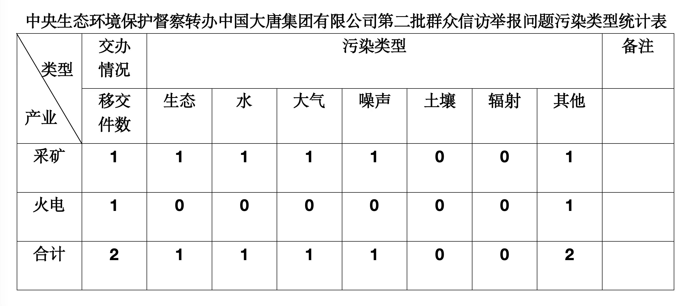 2025年6月4日,中央第七生態環境保護督察組向中國大唐集團有限公司移交第二批群眾信訪舉報件,共計2件,來電舉報和來信舉報各1件,涉及生態問題1個、水問題1個、大氣問題1個、噪聲問題1個、其他問題2個。所有舉報件辦理工作已第一時間進入調查核實辦理程序,辦理情況將按照相關要求反饋督察組,并及時向社會公開。